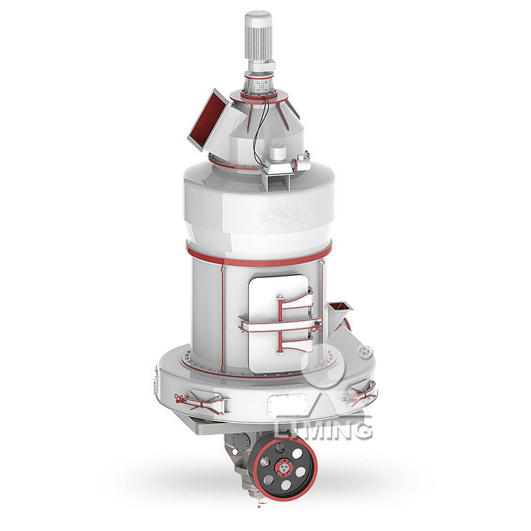 物料通過給料裝置被均勻地送至主機磨腔,在離心力和鏟刀作用下,物料在磨輥和磨環之間受到擠壓、研磨而被粉碎,粉碎后的物料在風力的作用下吹向選粉機進行分選,分選后的合格物料經管道進入旋風集粉器收集,未達到細度要求的物料重新回到主機再次研磨。
