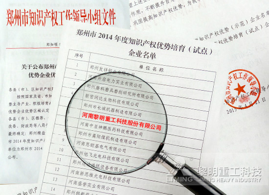 歷時四個月,經高新區推薦、專家組評審,鄭州市知識產權局、科技局、發改委、財政局等八局委聯合評審后,鄭州市知識產權工作領導小組公布最終名單,黎明重工被認定為“2014年度知識產權優勢培育企業”,據悉,此次評選共有21家單位入席。