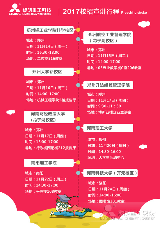 2017年集團公司人才引進統(tǒng)一部署,尋找共同的事業(yè)伙伴加入我們。在接下來的一段時間內(nèi),黎明重工HR團隊將相繼走進鄭州輕工業(yè)學(xué)院、鄭州大學(xué)、河南理工大學(xué)、鄭州航空工業(yè)管理學(xué)院及河南財經(jīng)政法大學(xué)等知名學(xué)府展開2016校園招聘宣講會,歡迎大家參加。屆時您將可以近距離與我們的HR交流更多詳細信息。