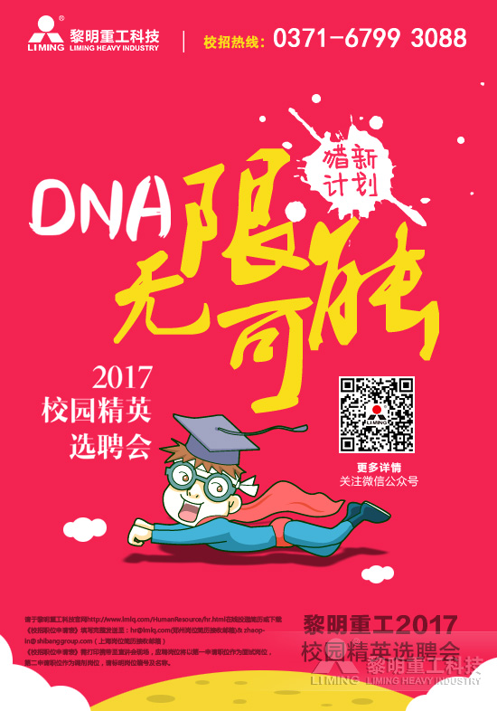 “傲青春·夢想飛揚季”、“傲青春·夢想綻放季”、“下一站,黎明”,“獵新計劃——青年青年站出來”,“獵新計劃——趁年輕,干漂亮的事兒”這些主題鮮明的精英選聘會讓學(xué)子們印象深刻。每一場的宣講,每一次的熱忱溝通,每一站的追隨,黎明重工吸引了各大高校佼佼者的加入,成為這個群體中口口相傳的企業(yè)。“獵新計劃——DNA創(chuàng)造無限可能”2017年黎明重工校園精英選聘會正式啟動。