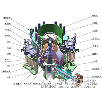 CS圓錐破碎機(jī)主要由機(jī)架、定錐總成、動(dòng)錐總成、彈簧機(jī)構(gòu)、碗型軸架部和傳動(dòng)等部分組成;其輔助部分由電氣系統(tǒng)、稀油潤(rùn)滑系統(tǒng)和液壓清腔系統(tǒng)組成。